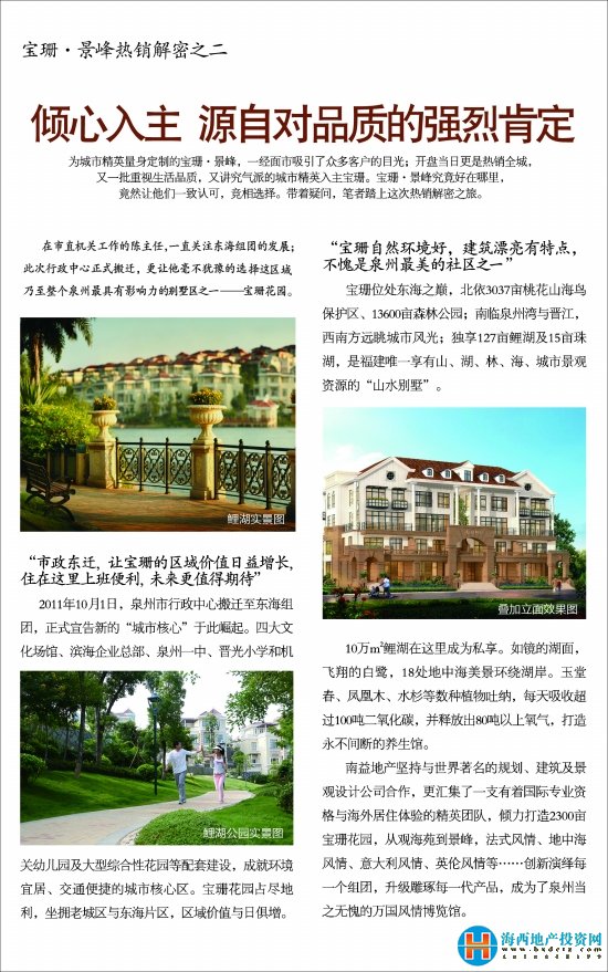 (海西地產投資網12月14日報道)寶珊景峰12月3日正式對外開盤后取得了良好的認購成績,日前,寶珊景峰特別策劃了其熱銷的原因解密,其原因之二:業主對寶珊17年品質的強烈肯定。