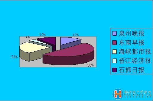 上周泉州5家平面媒體都有廣告投放,其中東南早報(bào)共有11.5個(gè)版,其廣告占5家媒體總量的50%,位居第一;海峽都市報(bào)共有5.5個(gè)版,其廣告占5家媒體總量的24%,位居第二;泉州晚報(bào)共有2.5個(gè)版的廣告投放,其廣告占5家媒體總量的12%,位居第三。