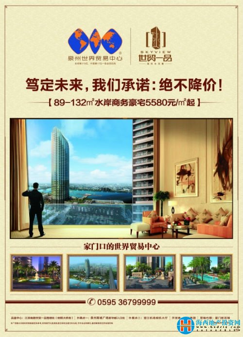 位于泉州濱江商務區的泉州世貿中心89-132平商務豪宅5580元/平起,承諾絕不降價。在這個房價下行的階段承諾不降價,體現開發商的決心和實力。