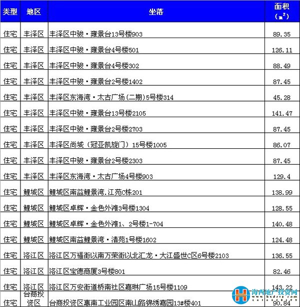 根據海西地產投資網研究中心分析得出,2012年5月10日泉州住宅成交18套,其中鯉城4套,豐澤10套,洛江3套,臺商投資區1套;泉州商業成交9套,其中鯉城成交4套,洛江成交5套。