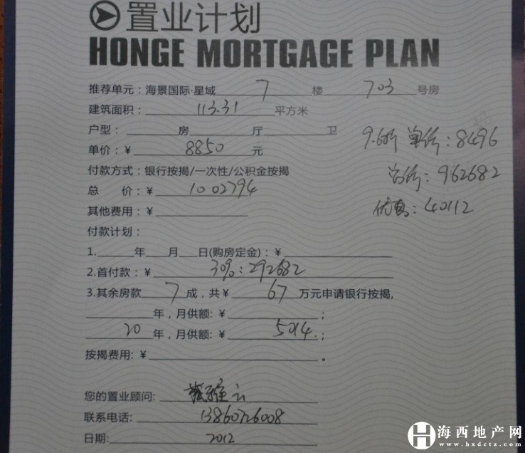 (海西地產網8月16日報道)8月16日上午記者前往海景國際花園售樓部踩盤。雖然海景國際星域近期并沒有什么宣傳動作,但人氣依舊不減,當記者到達項目售樓部時,有不少客戶正在和置業顧問簽約。據悉,目前該項目有113平的珍稀N+1在售,但目前最低樓層為7樓。置業顧問現場為記者做了一份海景國際星域7號樓703的置業計劃。
