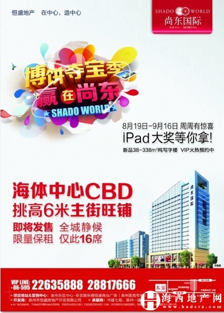 (海西地產(chǎn)網(wǎng)8月23日報道)尚東國際項目于8月19日-9月16日舉辦“博餅奪寶季 贏在尚東”的大型互動活動,周周有驚喜,ipad大禮等你拿!另據(jù)悉,其新品38-338平寫字樓,vip現(xiàn)正火熱預(yù)約中。16席挑高6米主街旺鋪即將發(fā)售。