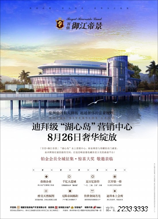 (海西地產(chǎn)網(wǎng)8月24日?qǐng)?bào)道)百信御江帝景迪拜級(jí)“湖心島”營(yíng)銷中心即將于8月26日(本周日)奢華綻放。鉑金會(huì)員全城征集,驚喜大獎(jiǎng),敬邀親臨。