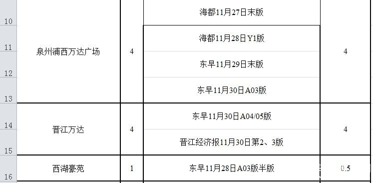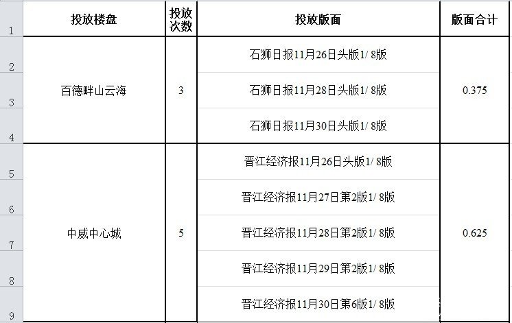 在投放的次數和版面上,上周共有20個樓盤,共投放27個版,其中泉州浦西萬達廣場和晉江萬達廣場均投放4個版,并列第一;海景國際和偉潤帝景均投放2.5個版,并列第二;本周相較上周投放樓盤減少了6個,投放版面也隨之減少了5.666個版,投放次數也少了2次;