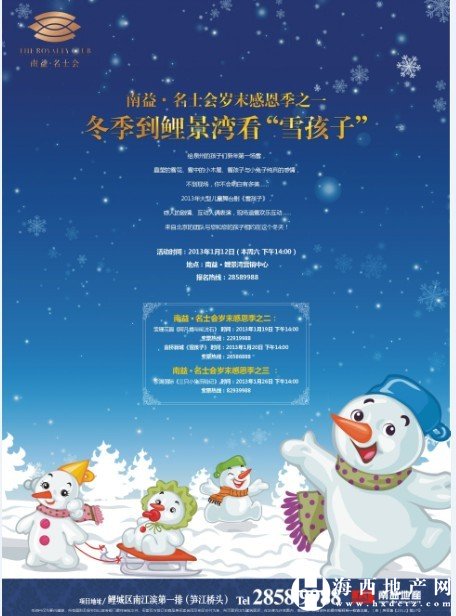 (海西地產(chǎn)網(wǎng)1月10日報道)南益名士會歲末感恩季之一,冬季到鯉景灣看“雪孩子”,2013年1月12日(本周六)下午2點于鯉景灣售樓部正式開始。