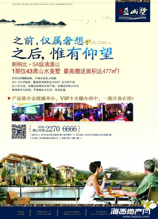 海西地產網11月7日消息:之前,僅屬奢享;之后,唯有仰望。美裕藍山墅1期僅43席山水美墅,最高贈送面積達477㎡!產品推介會圓滿舉辦,現VIP火爆辦理中,一期開盤在即!