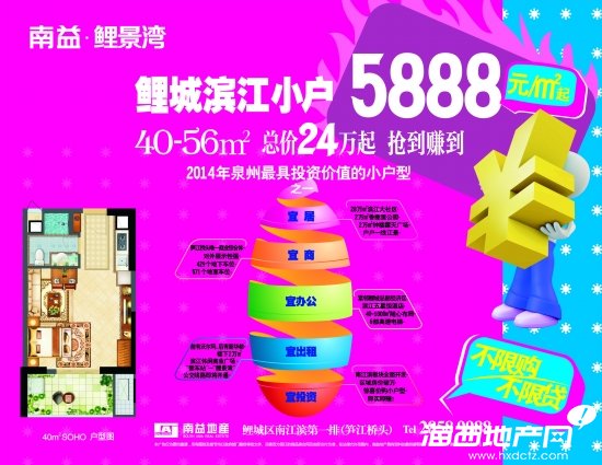 海西地產網3月28日消息:南益鯉景灣40~56㎡鯉城江濱小戶5888元/㎡起,總價24萬起,搶到即賺到!2014年泉州最具投資價值的小戶型,不限購不限貸!