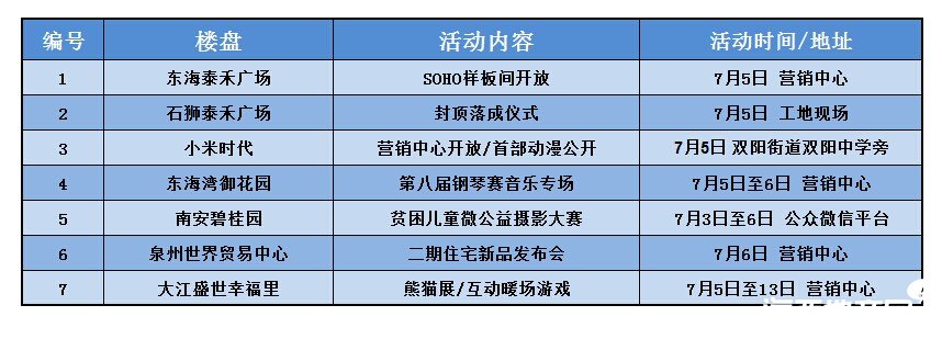 本周活動有3個新盤公開對外,以營銷中心開發及新品發布會為節點集結各界目光。東海泰禾廣場高額揮斥邀請臺灣女神林志玲助陣營銷中心開放后,于本周六誠邀靈魂歌后-郁可唯親臨現場,品鑒SOHO樣板間盛大啟幕;現首推8#樓、9#樓頂級商務SOHO,戶型面積:50-600㎡、50-1070㎡(百變空間)。【相關閱讀:東海泰禾廣場SOHO戶型亮相 7.5樣板開放】同時,已成功招商入駐150多加國際知名品牌-石獅泰禾廣場,7月5日上午9時,“石獅泰禾廣場封頂盛典”將在泰禾廣場工地現場盛大舉行,可謂是人逢喜事精神爽。【相關閱讀:石獅泰禾廣場:繼150家大牌搶駐后 7.5榮耀封頂】