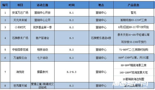在本周活動中暫時沒有開盤的項目,倒是有兩個新盤營銷中心開放,它們分別是安溪萬達廣場和天元未來城。8月1日18:00,安溪萬達廣場營銷中心盛大開放,內地著名女歌手馬郁將親臨現場,傾情獻唱;8月2日,天元未來城,首屆動車旅游季開啟暨營銷中心盛大公開,當天將送出港澳、蘇杭、烏鎮、西塘、廈門游等等。