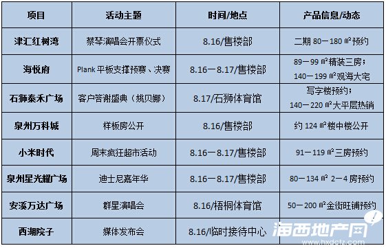 泉州萬科城新品約124㎡樓中樓樣板房公開;西湖院子舉行媒體發(fā)布會,將為大家褪去神秘的一面;泉州星光耀廣場現(xiàn)在已經(jīng)啟動預約,舉行迪士尼嘉年華活動,將為項目和新品造勢,贏得更多人氣;安溪萬達廣場和津匯紅樹灣的活動內(nèi)容均涉及明星演唱會,請大咖的明星效應依舊受青睞;小米時代和海悅府周末各自舉辦生趣、刺激的小活動來幫大家輕松度過一個愉快的周末;石獅泰禾廣場舉辦客戶答謝盛典,盛情邀請人氣歌手姚貝娜為大家獻唱,躁動激情盛夏!