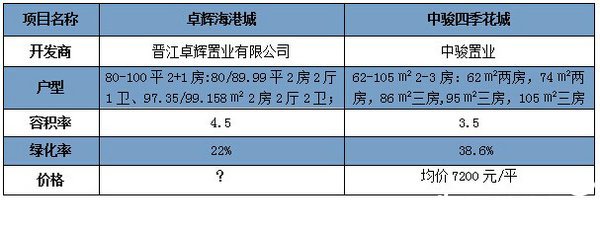 據悉,目前中駿四季花城均價為7200元/平,雖然卓輝海港城在整個區位和交通上比中駿四季花城略好,但是中駿四季花城擁有戶型、小區密度等優勢,綜合之后卓輝海港城的價格預計不高于7200元/平。具體戶型、項目容積率、綠化率差異如下表格: