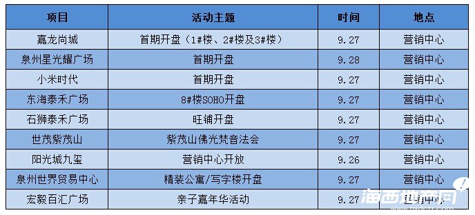 此外,泰禾集團旗下第三座泰禾廣場-東海泰禾廣場火熱加推,自9#樓SOHO開盤即售罄,1小時狂銷360套;為了滿足購房者需求,再次加推8#樓SOHO,將于27日盛大開盤;品牌房企陽光城九璽在久經沉淀終于面市,營銷中心于9月26日正式對外開放;不僅如此,部分樓盤也蓄勢待發準備暖場活動,集聚人氣;位于晉江世茂紫茂山“梵音修心 同享法喜——紫茂山佛光梵音法會”,9月27日開啟;9月27日,宏毅百匯廣場舉辦親子嘉年華活動,盛大啟幕。