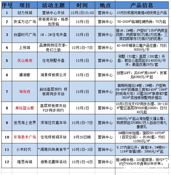 10月1日,臺商區臺盛時代廣場(110套)和豐澤區優山美地(338套)兩盤首開,臺盛時代廣場首推1#、2#樓110套高層【詳情】, 優山美地53套別墅和285套高層住宅同步推出【詳情】;樣板間開放的5個樓盤中,海悅府和美裕藍山郡高層樣板房開放的同時也啟動 VIP預約,其中東海新盤海悅府在經過一段長時間的推廣后,首次啟動預約,將備受關注【詳情】;而繼別墅熱銷后的美裕藍山也選擇 在國慶啟動高層預約,同樣引發關注【詳情】!值得關注的還有東海泰禾廣場,繼SOHO完銷后,一向“高速運轉”的泰禾一期住宅-泰禾 首璽即將推出,抄底價8988元/㎡起,VIP預約火爆,今晚(30日)戶型樣板間也即將公開!【詳情】另外,安溪萬達廣場樣板間開放盛 邀女神楊恭如一同品鑒,而創意Loft熱賣瀾湖郡湖景樣板房也將揭開神秘面紗!