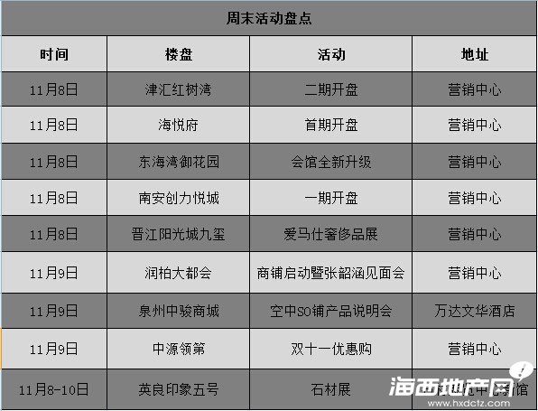 就在本周末,就已有3個項目準備開盤。分別是津匯紅樹灣二期1#、6#、8#、10#樓房源370套;海悅府首期1#樓66套;南安創力悅城首期48套。其中,海悅府與創力悅城均是純新項目。11月第一波的開盤潮已經來臨,而之后,東海泰禾廣場、泉州星光耀廣場、美裕藍山郡等項目或將緊跟開盤步伐。