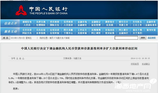 11月21日,中國人民銀行官網發布消息稱,決定自2014年11月22日起下調金融機構人民幣貸款和存款基準利率。金融機構一年期貸款基準利率下調0.4個百分點至5.6%;一年期存款基準利率下調0.25個百分點至2.75%,同時結合推進利率市場化改革,將金融機構存款利率浮動區間的上限由存款基準利率的1.1倍調整為1.2倍;其他各檔次貸款和存款基準利率相應調整,并對基準利率期限檔次作適當簡并。