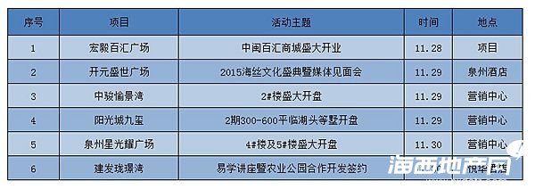 據悉本網不完全統計:11月28日,宏毅百匯廣場開業耀世開業,亞洲小姐冠軍房星彤親臨助陣【詳情點擊】;29日,自面市以來備受購房者熱力追捧63萬平城市綜合體中駿愉景灣,2#樓100-125㎡(3房至4房),盛大開盤【詳情點擊】;同日,陽光城九璽二期300-600平臨湖傳世頭等墅盛大開盤,五重購房驚喜將揭曉。【詳情點擊】同時,在海上絲綢之路藝術節在泉州火熱開幕,開元盛世廣場以海絲文化為主題“2015海絲文化盛典”暨媒體見面會啟幕。【詳情點擊】