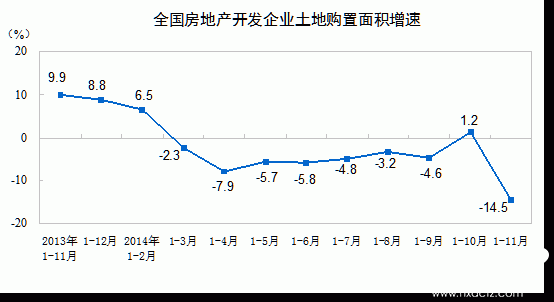 1-11月份,房地產開發企業土地購置面積29736萬平方米,同比下降14.5%,1-10月份為增長1.2%;土地成交價款8657億元,下降0.1%,1-10月份為增長20.4%。