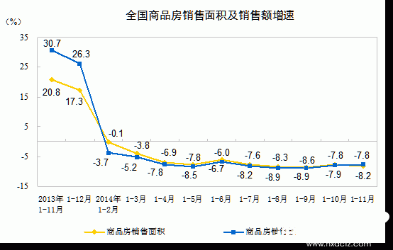 1-11月份,商品房銷售面積101717萬平方米,同比下降8.2%,降幅比1-10月份擴大0.4個百分點。其中,住宅銷售面積下降10.0%,辦公樓銷售面積下降9.2%,商業營業用房銷售面積增長7.1%。商品房銷售額64481億元,下降7.8%,降幅比1-10月份收窄0.1個百分點。其中,住宅銷售額下降9.7%,辦公樓銷售額下降20.9%,商業營業用房銷售額增長7.2%。