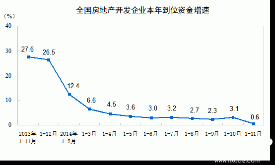 1-11月份,房地產開發企業到位資金110115億元,同比增長0.6%,增速比1-10月份回落2.5個百分點。其中,國內貸款19252億元,增長9.0%;利用外資530億元,增長11.8%;自籌資金46243億元,增長8.2%;其他資金44089億元,下降9.3%。在其他資金中,定金及預收款26810億元,下降12.2%;個人按揭貸款12130億元,下降4.2%。