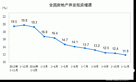 2014年1-11月份,全國房地產開發投資86601億元,同比名義增長11.9%,增速比1-10月份回落0.5個百分點。其中,住宅投資58676億元,增長10.5%,增速回落0.6個百分點。住宅投資占房地產開發投資的比重為67.8%。