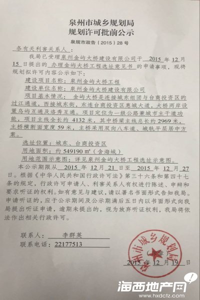 今日,記者在泉州規劃局官網上發現最新公開的泉州金嶼大橋工程選址示意圖以及審批公示。泉州金嶼大橋用地面積約549190㎡(含海域),是連接城東組團與臺商投資區的過江通道。項目定位為一級公路兼城市主干道功能,主線全長約4132米,其中橋梁主線總長約2969米,主橋橫斷面寬59米,主橋采用雙向八車道、城軌平層居中方案。