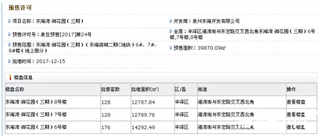 12月15日,根據(jù)泉州市住建局網(wǎng)站顯示,坐落于豐澤區(qū)港灣街與東宏路交叉西北角東海灣·御花園(三期)6號(hào)樓,7號(hào)樓,8號(hào)樓成功取得預(yù)售許可證,預(yù)售面積為81828.0㎡,新增商品住宅416套