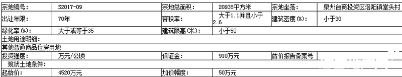 2、地塊競得人應自競得該宗地的土地使用權之日起10個工作日內與泉州臺商投資區城市建設發展有限公司簽訂《泉州臺商投資區S2017-09號地塊安置房回購協議》,回購的住宅建筑面積不少于34000平方米,回購價為3000元/平方米,回購車位280位,回購價為7萬元/位;