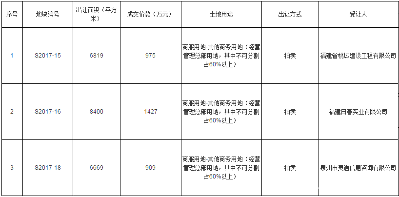 2月7日,泉州臺商投資區S2017-15號、S2017-16號、S2017-17號三宗國有土地使用權成功出讓,分別由福建省桃城建設工程有限公司、福建日春實業有限公司、泉州市靈通信息咨詢有限公司競得。