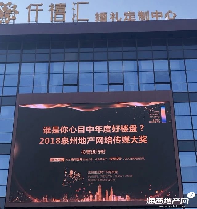 正值線上投票活動激烈角逐之際,2018泉州地產網絡傳媒大獎線下推廣同步鋪開。近日,位于泉秀街與云鹿路交匯處的仟禧匯和位于東湖街與刺桐路交匯處的湖美酒店的戶外活動宣傳正式出街,高端視聽傳播平臺輪回播放,網羅龐大人流、車流的視覺,多角度、多渠道地傳達,引發行業聚焦。