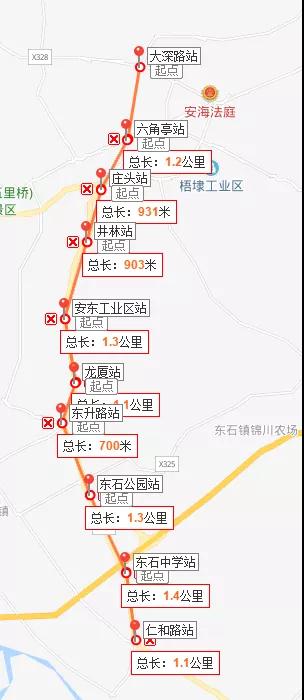 大深路站-六角亭站-莊頭站-井林站-安東工業(yè)區(qū)站-龍廈站-東升路站-東石公園站-東石中學站-仁和路站。
