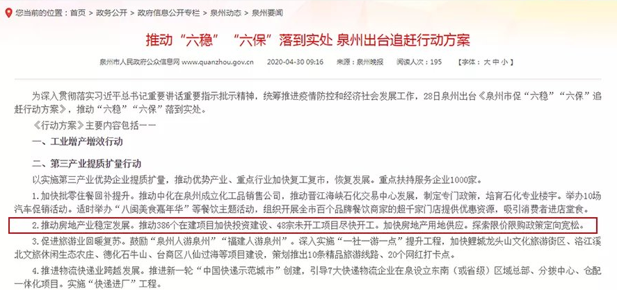 4、在今年4月30日,泉州出臺的推動“六保”、“六穩”方案中提及“探索限價限購定向寬松”,雖然只是探索,但其實在近年,除了政策嚴苛的中心城區,泉州其他區域已陸續有松動跡象,而今石獅方面推行的全新改革,或也是執行定向寬松的一步,樓市“松限”大方向已十分明確。