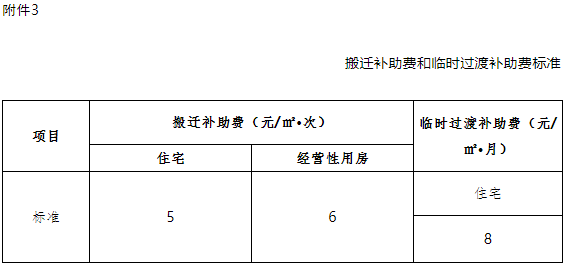 1.住宅:按經認定的建筑面積計算,標準為 5 元/㎡·次(詳見附件3)。被征收人選擇貨幣補償的,發放一次搬遷費;被征收人選擇產權調換的,發放兩次搬遷費。