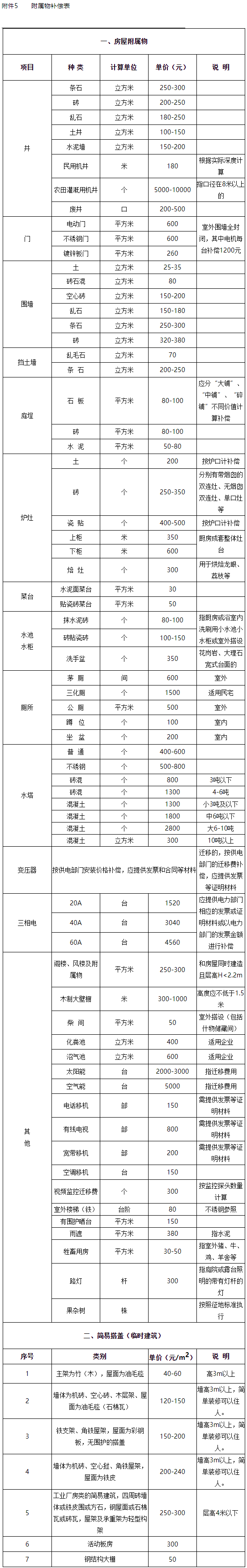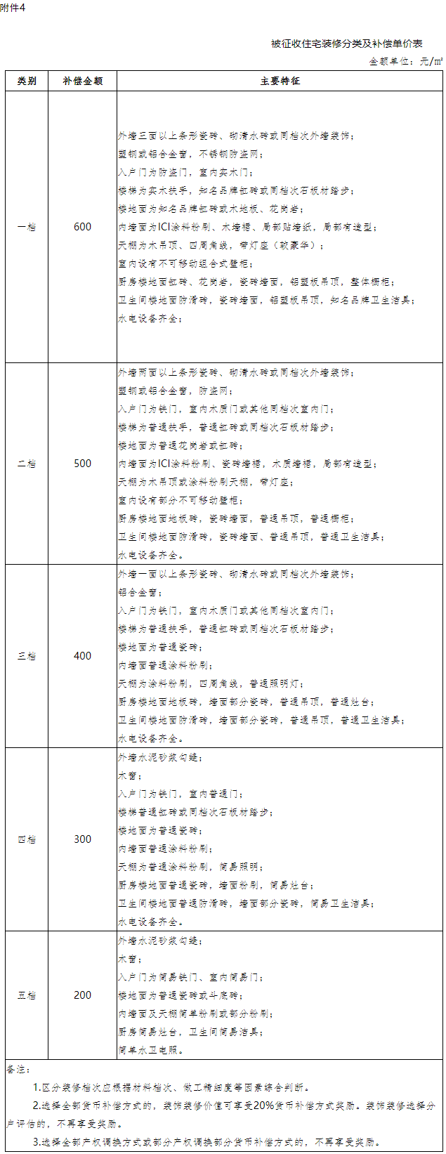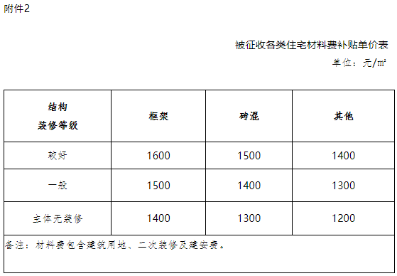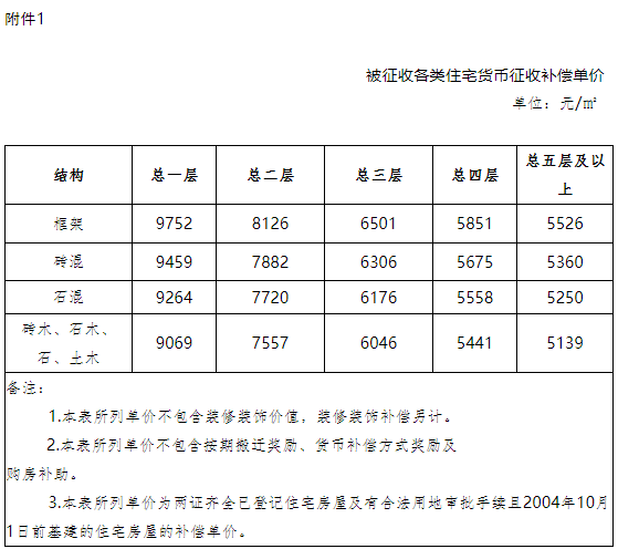 1、住宅的補償標準:本方案第七條、第八條所列各類住宅房屋按相應補償單價計算(詳見附件1)。被征收房屋裝修補償單價單獨計算(詳見附件4)。