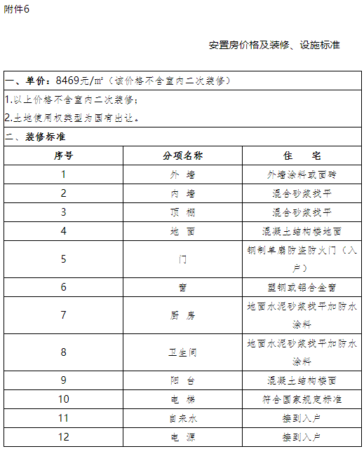1.本方案擬安置房源存量安置房評估基準價格為8469元/㎡。在簽約期限內簽訂協議并搬遷,選擇產權調換的安置房優惠后的結算價格為6501元/㎡。