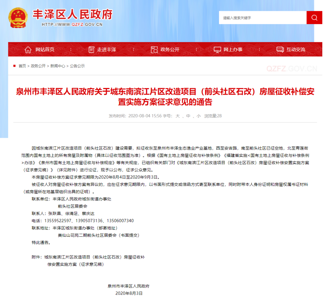 8月4日,泉州市豐澤區人民政府發布了關于城東南濱江片區改造項目(前頭社區石改)房屋征收補償安置實施方案征求意見的通告。