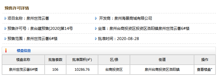 8月28日,根據泉州住建局發布位于臺商區的泉州世茂云著6#樓獲批預售,共106套住宅房源,整體均價約9849元/㎡,價格區間8571.84-11117.11元/㎡。
