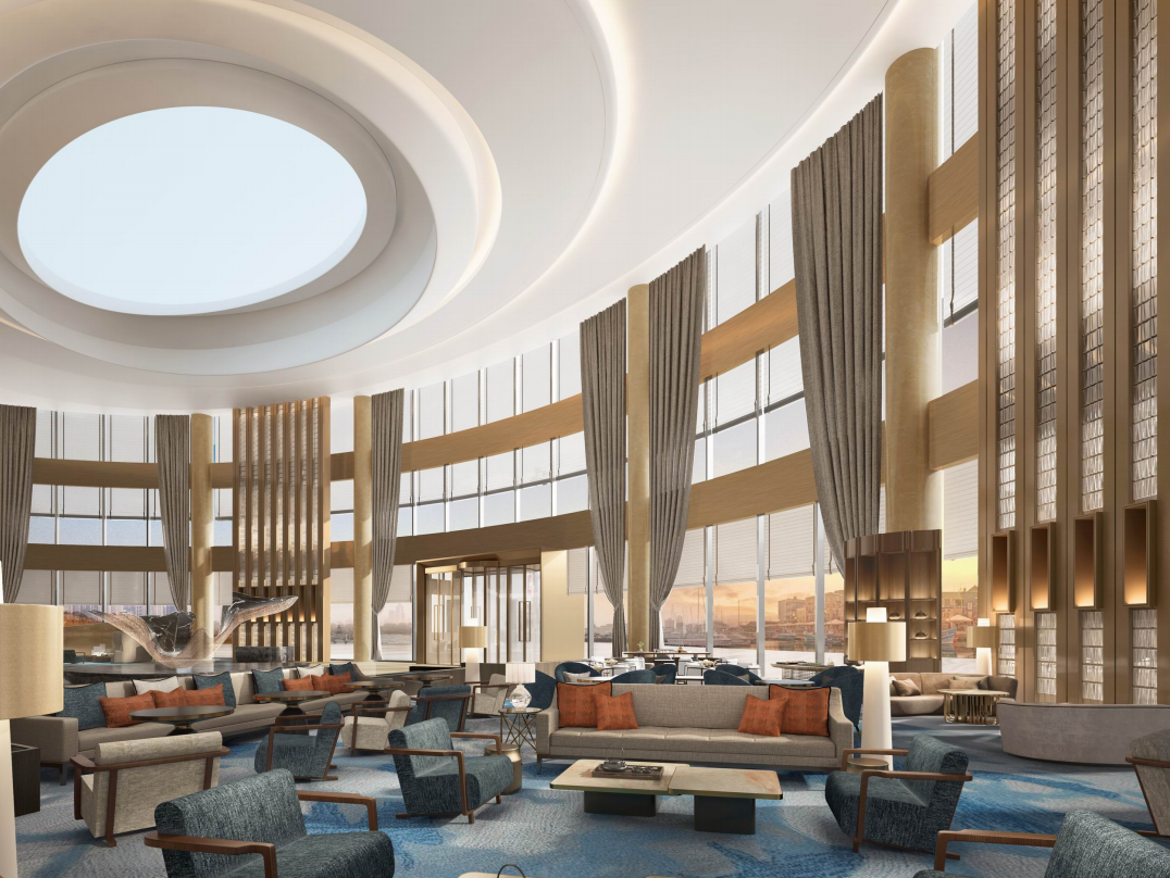 源昌凱賓海景大酒店總建筑面積89426平方米,建筑總高度138米,酒店大堂高約16米,內設約2500㎡宴會廳、健身會所、恒溫泳池等,是一家集商務元素和現代設計手法相融合的最新一代國際商務酒店。