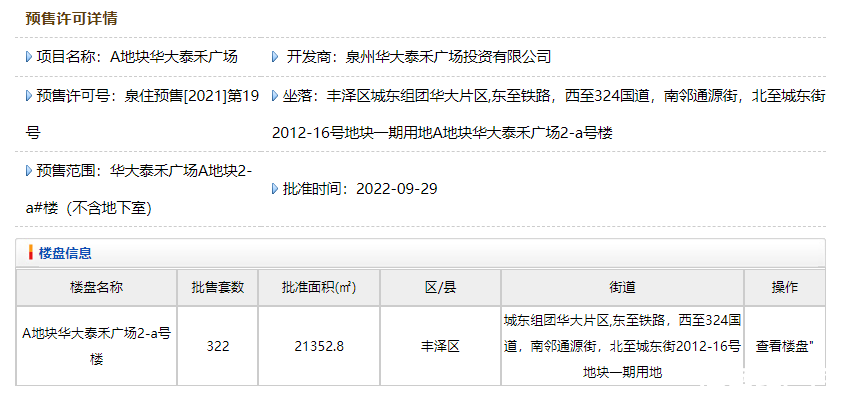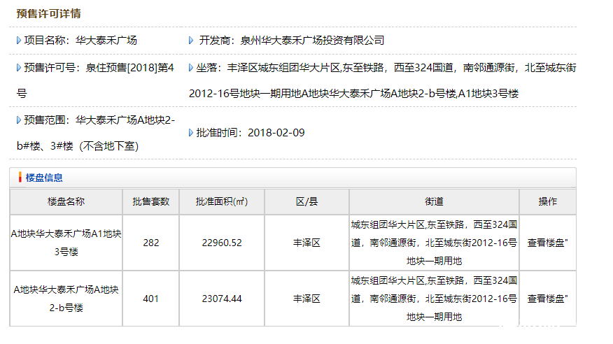 早于2018年初,華大泰禾廣場A地塊2-b號樓、A1地塊3號樓已取得預售許可證,其中2-b#樓批售套數401套(商鋪18間、辦公房源383套),3#樓批售套數283套(7間商鋪、276套辦公房源)。