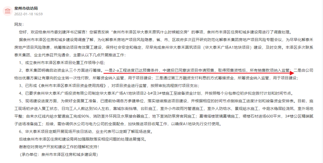 泉州金控集團權屬市資管公司與豐澤城建集團,將共同以提供紓困資金的形式,為該項目的“保交樓”提供資金支持,項目近期將正式復工并加快推進收尾工作,預計年底前竣工備案。