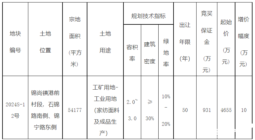 該宗地申請人還應符合:在國內已投產的工業項目中已采用MES系統實現家紡信息共享,協同制造、協同管理,用互聯網信息技術融合先進家紡智能裝備,擁有自動化、數字化、智能化家紡快反供應服務平臺。通過超算系統與AIGC大模型和ERP系統相結合,實現高端家紡面料成品生產-AI設計端-供應鏈端-銷售端全體系化貫通,具有家紡產業鏈全流程管理能力。該項要求由申請人于2024年8月27日前向市發改局申請審核,由市發改局聯合市工信科技局、錦尚鎮人民政府將審核結果函告市自然資源局及申請人(咨詢電話:小許88710790)。