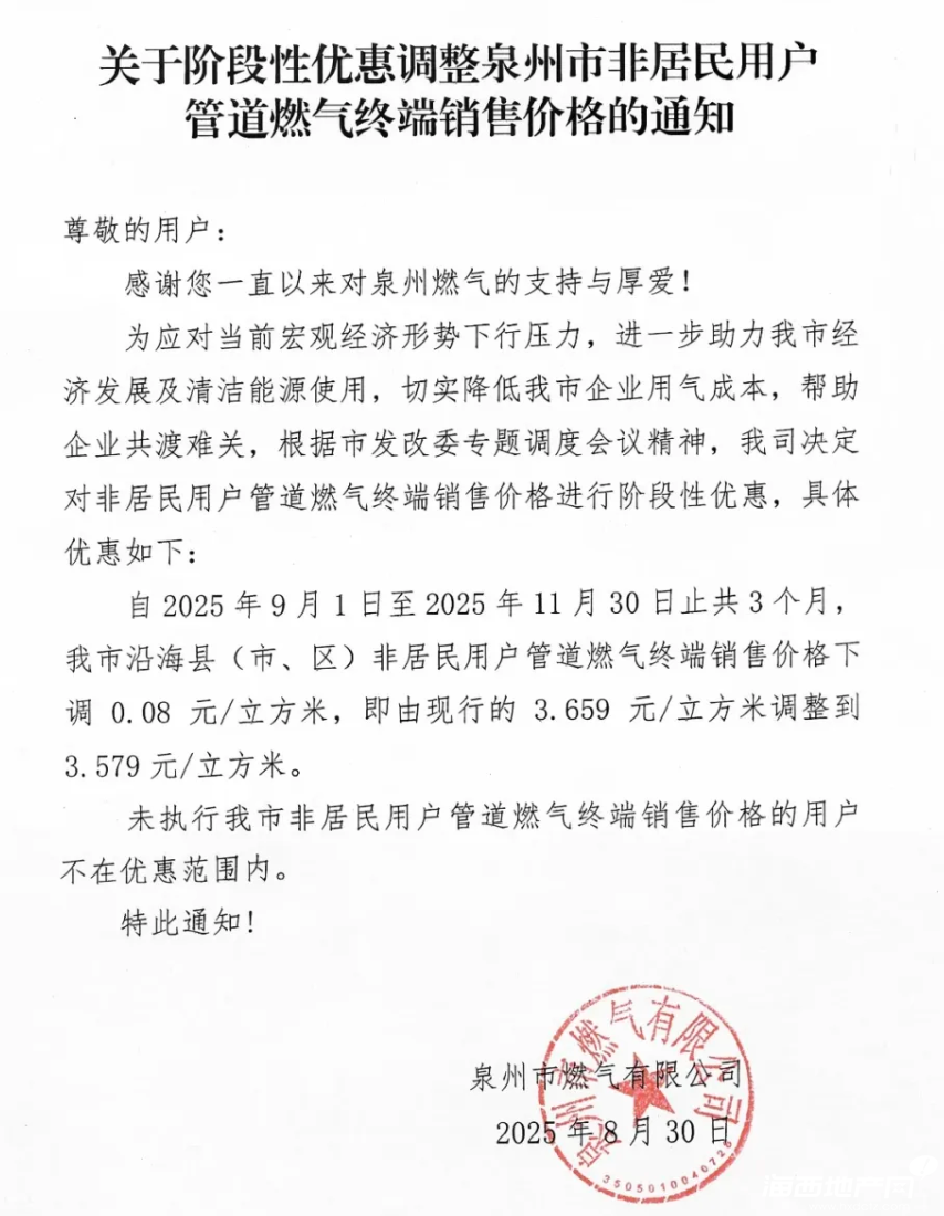 好消息!泉州這一燃氣價格下調!