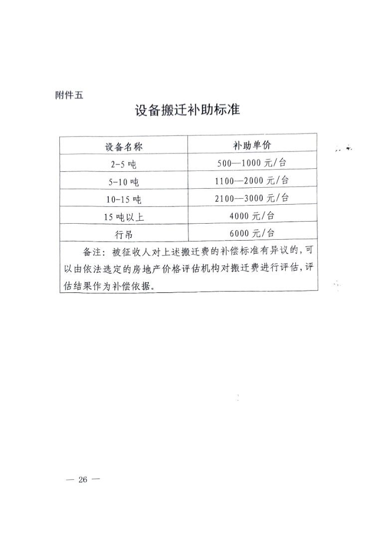 3.企業廠房:按經認定的可補償面積計算,標準為6元/㎡·次,發放一次搬遷費。其中,(1)對于可恢復使用的設備由被征收人自行處置,按附件五給予搬遷費;對本方案中搬遷費有異議的,也可選擇由依法選取的評估公司對搬遷費進行評估,根據評估結果進行補償。(2)對于因搬遷喪失使用功能的機器設備設施,由被征收人提出申請,經現場核實后,由具有相應資質的評估公司進行評估,根據評估結果進行補償。