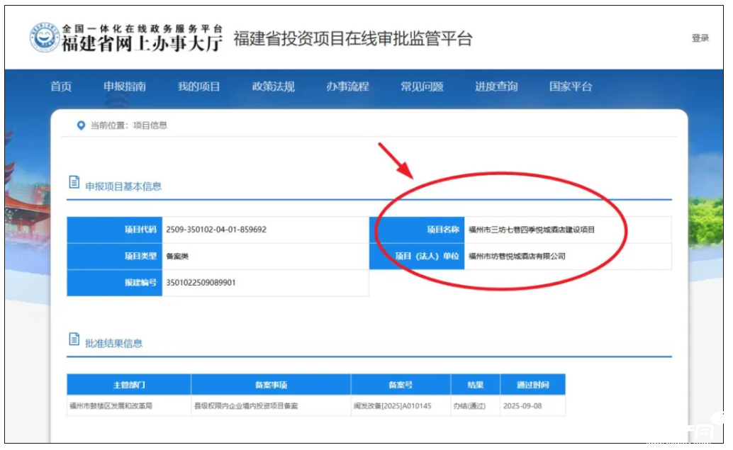 該項(xiàng)目報(bào)建編號(hào)3501022509089901,備案號(hào)閩發(fā)改備[2025]A010145,項(xiàng)目(法人)單位為福州市坊巷悅城酒店有限公司。批準(zhǔn)結(jié)果信息顯示辦結(jié)(通過(guò)),主管部門為福州市鼓樓區(qū)發(fā)展和改革局。