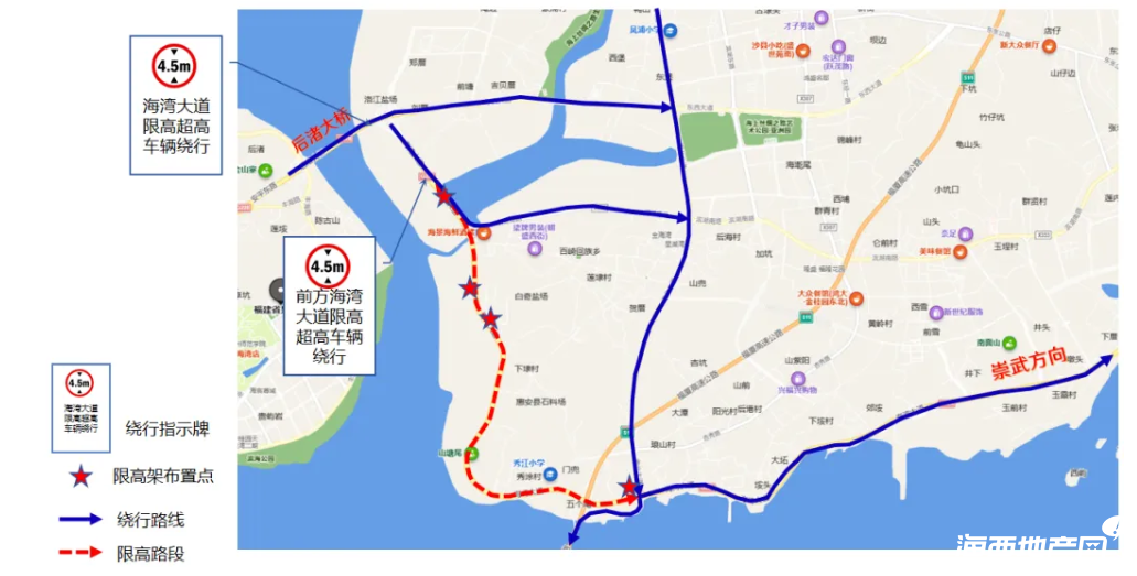 交警部門同時發布了相應的分流措施,(一)建議泉州市區、晉江、南安往崇武方向過境交通:①由后渚大橋→東西大道→南北大道→海灣大道繞行;②由后渚大橋→海江大道→海灣大道輔道→濱湖南路→南北大道→海灣大道繞行。