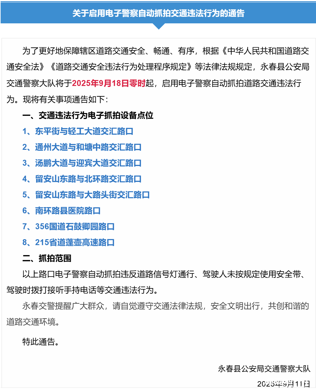 通告!永春這8個地點將啟用電子警察設備抓拍→