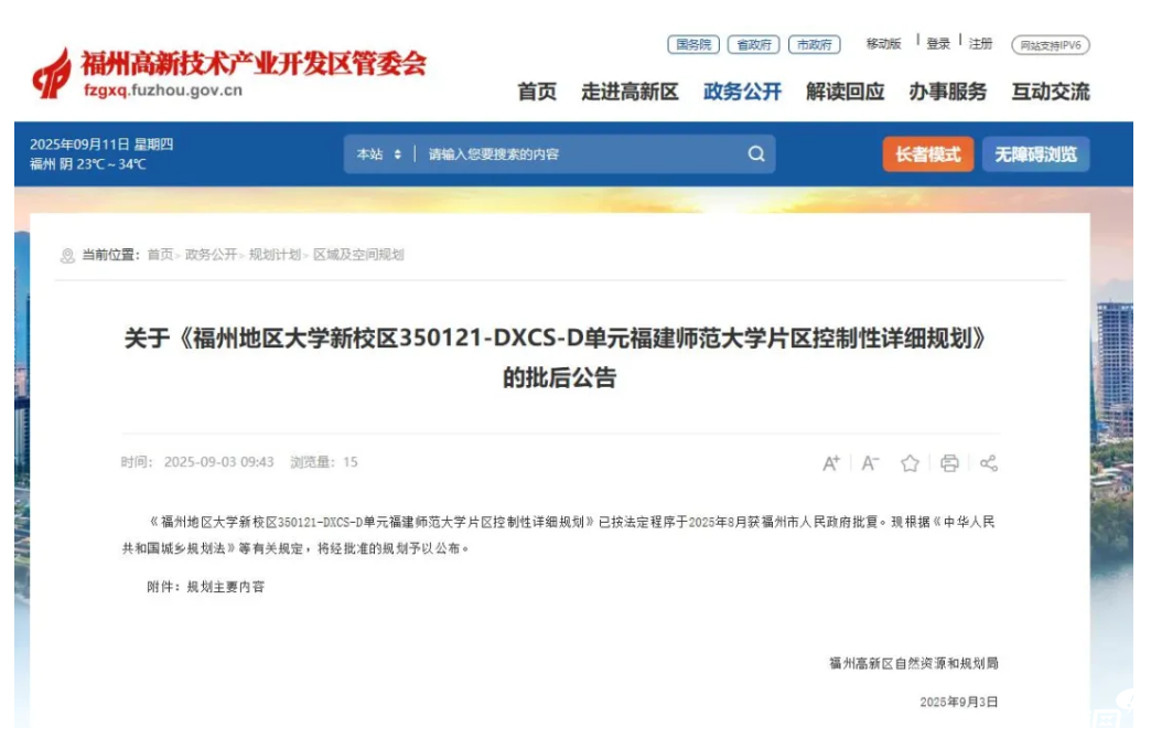 2025年9月3日,福州高新區(qū)自然資源和規(guī)劃局發(fā)布“關(guān)于《福州地區(qū)大學(xué)新校區(qū)350121-DXCS-D單元福建師范大學(xué)片區(qū)控制性詳細(xì)規(guī)劃》的批后公告 ”。