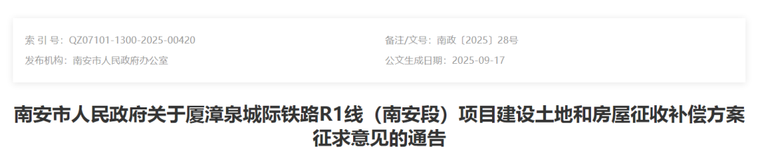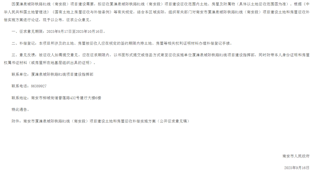 (一)本征收補償方案僅適用于廈漳泉城際鐵路R1線(南安段)項目建設。
