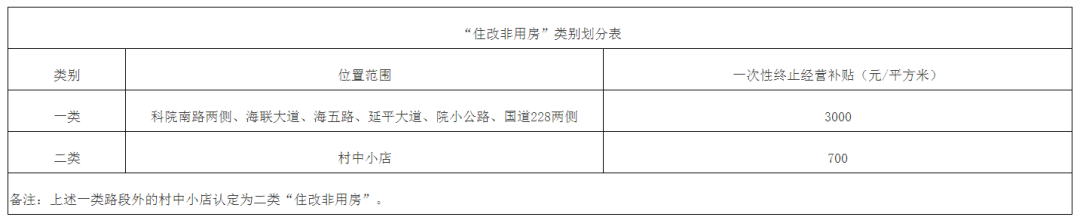 2.一次性終止經營補貼:按照認定的經營性面積給予一次性終止經營補貼,具體標準見下表。