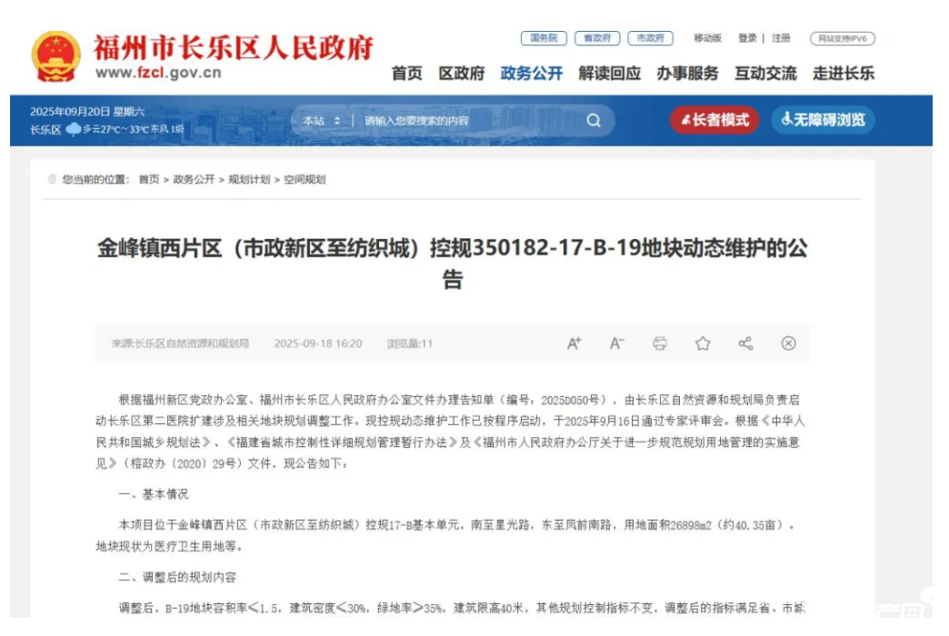 2025年9月18日,長樂區自然資源和規劃局發布“金峰鎮西片區(市政新區至紡織城)控規350182-17-B-19地塊動態維護的公告 ”。
