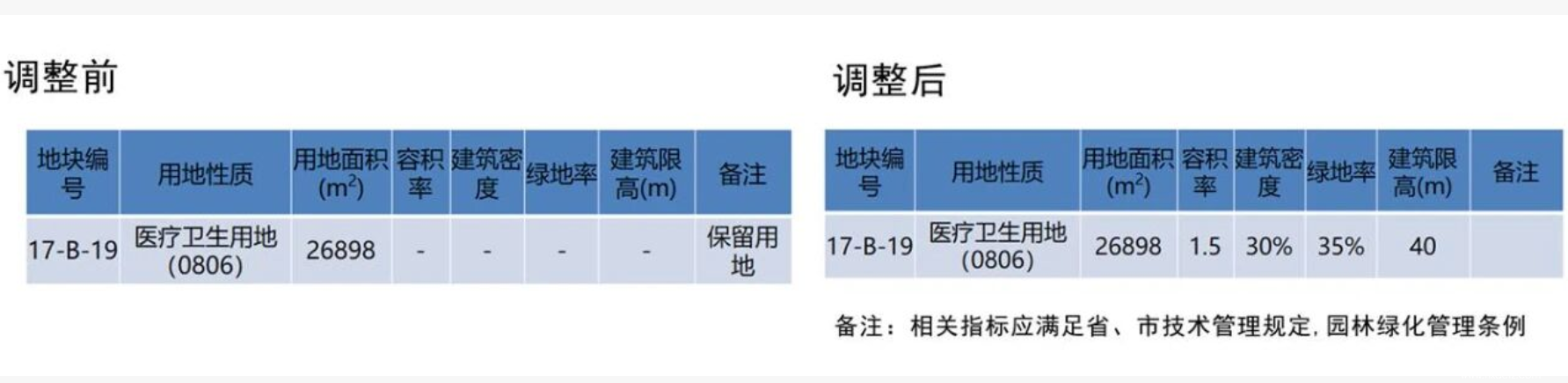 調整后,B-19地塊容積率≤1.5,建筑密度≤30%,綠地率≥35%,建筑限高40米,其他規劃控制指標不變,調整后的指標滿足省、市城市規劃管理技術規定。